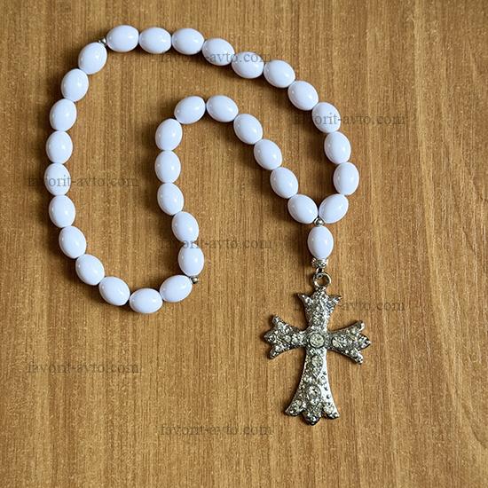 Подвеска на зеркало заднего вида, КРЕСТ крупный (БЕЛЫЙ), четки (белые) |