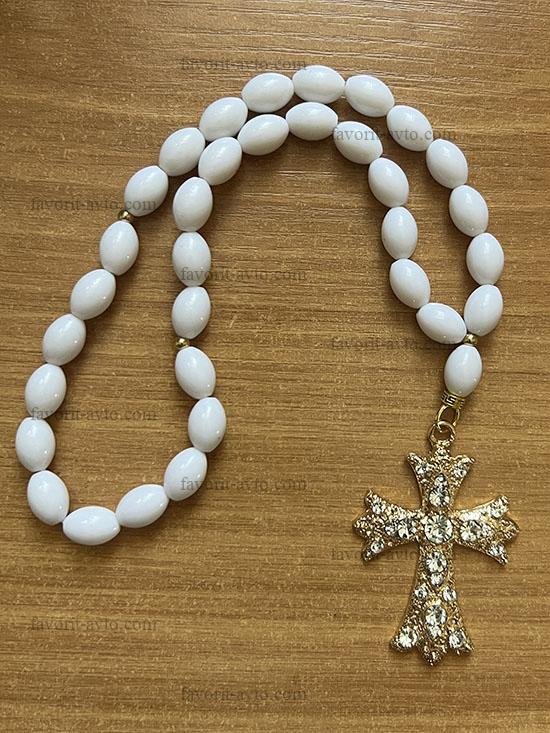 Подвеска на зеркало заднего вида, КРЕСТ с крупным камнем (ЗОЛОТО), четки (белые) |