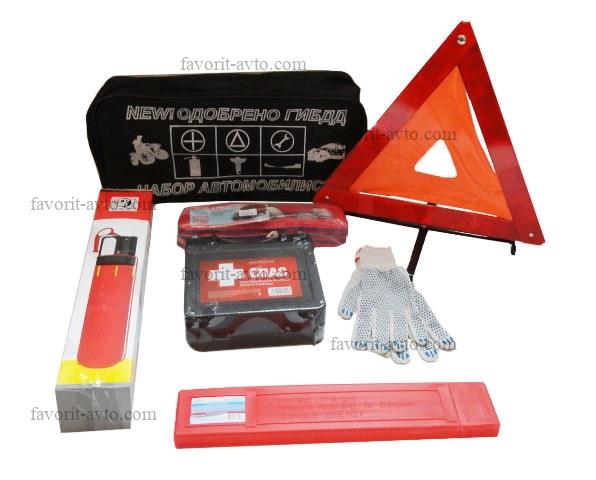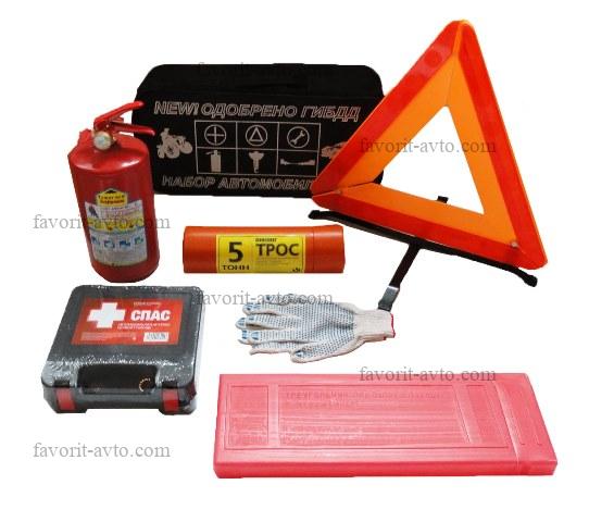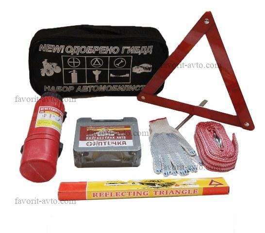 Набор автомобилиста / СТАНДАРТ /. Сумка, знак авар. остановки в пластиковом футляре, аптечка СПАС 2025г, огнетушитель 2л в картонной коробке, трос 5т. |