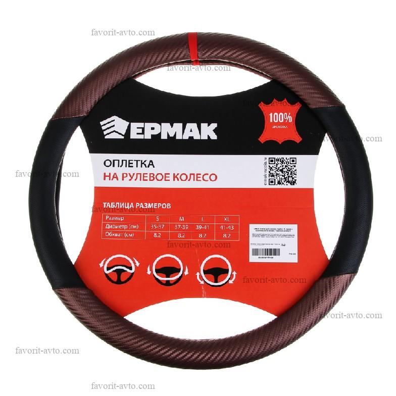 ЕРМАК Оплетка руля, экокожа, Карбон - В, черная с коричневыми вставками, + красный, размер М. 1/25 |