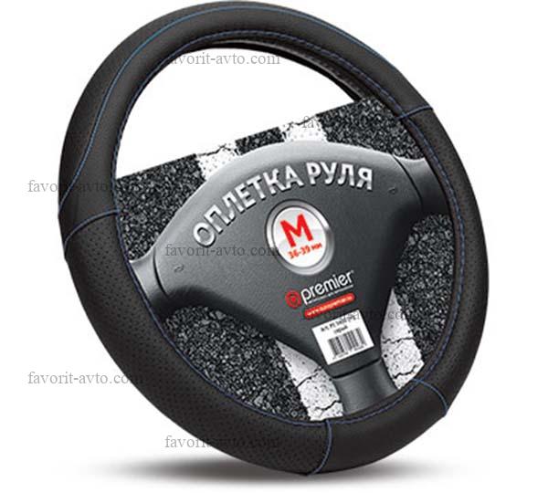 Оплётка руля PREMIER, кожа PU, перфорированная вставка, /ЧЁРНЫЙ-синяя нить/, размер (М), 1/25, FR1010M |